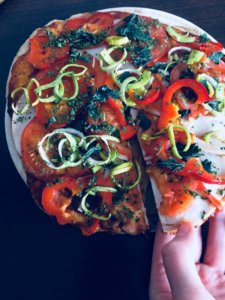 Ezután a paradicsomszószt és a feltéteket ízlés szerint rakoma tésztára és ha kész ,vissza teszem a sütöbe 20-25 percig 160 fokon tovább sütöm.