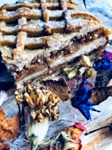 - Végül a maradék tésztából rácsokat csinálunk,majd lekenjük őket a felvert tojással.