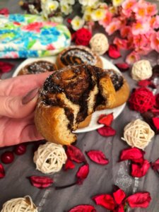 - Kinyújtjuk a tésztát ,megkenjük a kakós töltelékkel,feltekerjük ,közepes darabokat vágunk és a tetejüket lekenjük tojással,ettől szép fényes sárgás színű lesz.
