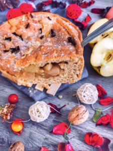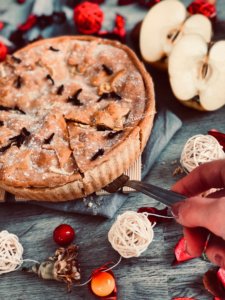 - Hozzáadjuk a dínsztelt almát és a tetejét beborítjuk a maradék tésztával.