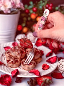 - Ezután (szilikonos) muffin formába töltöm a tésztát,majd az apró darabokra összevágott epret a tésztára szórom.