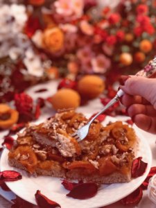 - A tepsit kókuszolajjal kikenjük és bele helyezzük a tésztánkat és a tetejére öntjük a barackos öntetünket.